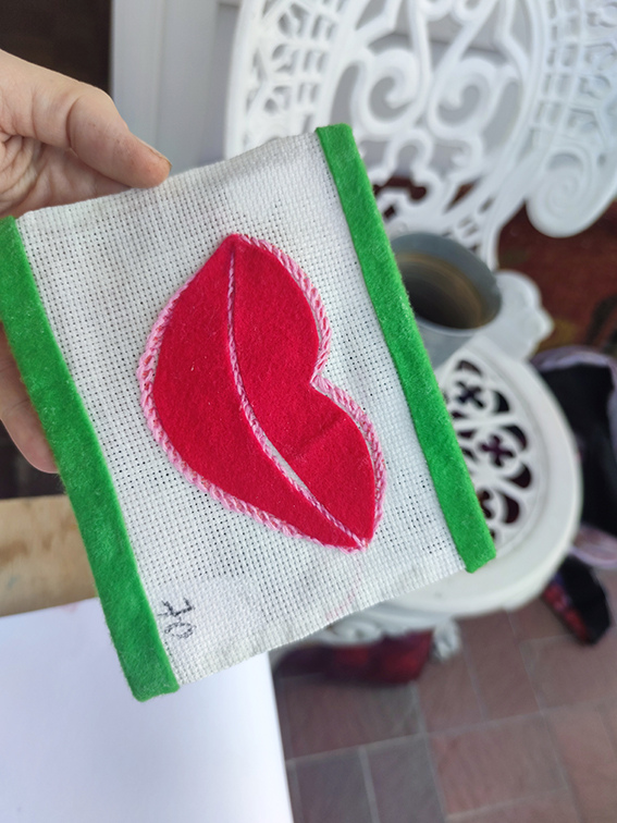 Piquer dans vos sourires est une responsabilité vagabonder dans mes pensées les mains dans quelque chose de concret pique pique pique fait l'aiguille et mes points alignés et ce geste répétitif qui me permet une forme de méditation je suis alors à la fois les mains dans quelque chose de très concret et la tête dans tous mes vagabondages forcément des pensées pour chacune et me dire que vos mains juste avant ont travaillé sur le même morceau de tissu je réalise alors que mon propre travail est un travail autour de l'existant j'ai toujours aimé le fils j'ai toujours aimé coudre depuis petite je dessine des silhouettes et les étoffes m'ont toujours fascinées c'est vrai que je voulais être costumière même le mot était magnifique à mes oreilles et puis le théâtre a attrapé mon ego peut-être l'envie d'être sur le plateau la découverte de la peinture graphisme des compositions. La matière de l'argile ça aussi toujours depuis l'enfance bref vos sourires me plongent dans mon passé ils me projettent dans tant d'envies et dans l'inconnu de ce voyage en Italie qui arrive bientôt je percute alors au rythme de ma machine que j'ai toujours travaillé sur l'existant.